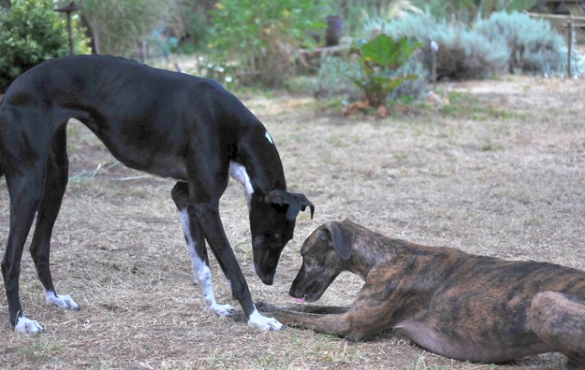 Je suis EMMA, la Galga barbuda adoptée par Anne et Patrick. Je n’ai pas fait le voyage d'Espagne vers la France seule, mais avec un compagnon de misère, lui aussi adopté par ma nouvelle famille, Il s’agit de Pablo un gentil mâstin de 46kg. Nous voilà depuis ce 24 octobre 2020 dans une maison en pleine campagne en Dordogne. Nos hôtes nous attendaient, 3 chiens, un Briard, un sans étiquette de la SPA et un Basset Griffon bleu de Gascogne adopté lui aussi. Il y avait également 4 chats, 8 chevaux et 2 ânes.
