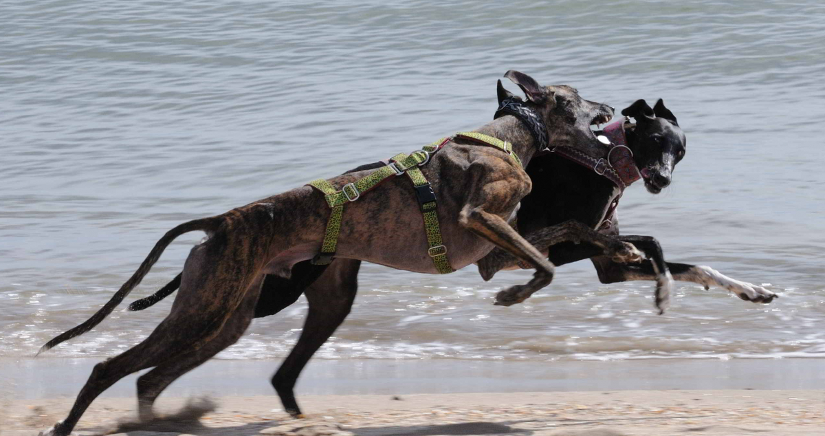 Depuis, tout a changé. Nous faisons des progrès chaque jour. Et ceci aussi grâce à Delphine, notre éducatrice de chiens. Viena n’est pas sans craintes non plus, mais elle les exprime différemment : elle est un lévrier qui aboît ! Quand elle n’est pas à l’aise, ne sait pas comment agir. Moi, j’ai plutôt tendance à fuir. Susanne et Christian ont fait et font en sorte de nous montrer le monde, d’autres endroits, d’autres humains … et oui, nous avons découvert que la vie est belle ! Et que les caresses, ça vaut le coup. Même de Christian dont j’avais si peur. Nous avons même découvert que l’on peut courir sans laisse pour le plaisir, pour jouer avec d’autres chiens et de rester auprès d’eux. A l’automne dernier, nous avons découvert la plage et la mer. Eh oui, nous sommes des lévriers qui aimons nous baigner tant que l’occasion se présente. Nous sommes très jeunes, tout juste deux ans, et il y a tant d’expériences encore à faire !